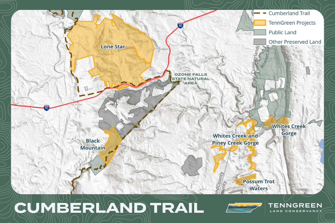 The Justin P. Wilson Cumberland Trail State Park stretches more than 300 miles across eastern Tennessee and is envisioned to one day run from Cumberland Gap National Historical Park to Chickamauga and Chattanooga National Military Park. Each land protection project helps bring this vision closer to reality, while also preserving Tennessee’s diverse natural heritage for future generations.